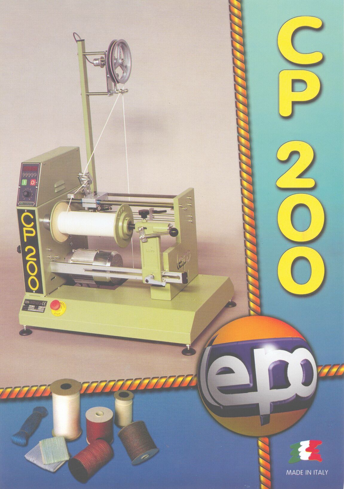 L'avvolgitrice CP200 è stata progettata per avvolgere trecce tonde o nastri piatti direttamente su rocchetti flangiati, cartelle piatte o per confezionare matasse. Dotata di contametri programmabile si arresta automaticamente a metratura impostata. La velocità di avvolgimento del prodotto è regolabile mediante un potenziometro ed il passo del traslatore può essere variato in modo semplice da 0 a 15 mm. Il traslatore garantisce inoltre la perfetta distribuzione delle spire sulla bobina, conferendo omogeneità e compattezza alla confezione. Studiata per un utilizzo estremamente semplice, non necessita di manutenzione e di utensili, sia per variare il passo del traslatore, che le dimensioni della bobina. Estremamente silenziosa e dagli ingombri ridotti, si adatta ovunque, salvaguardando gli spazi destinati alle macchine di servizio.